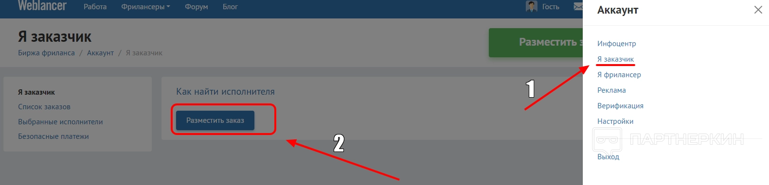 Чтобы найти исполнителей, необходимо зайти в аккаунт, выбрать пункт «Я заказчик» и нажать «Разместить заказ».