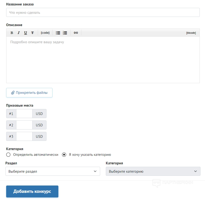 При создании конкурса исполнителю также нужно придумать название заказа, подробно описать задачу, выбрать раздел и категорию. В пункте «Призовые места» необходимо указать стоимость поощрения. Чем выше цена, тем большее количество исполнителей откликнется на задание. Можно добавить не более трех мест.