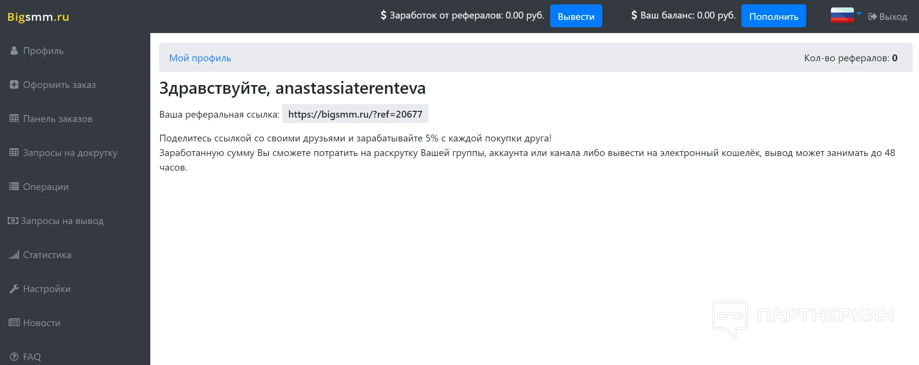 Также важным разделом являются разделы с реферальной программой — пользователи могут получать 5% с пополнений приглашенных пользователей, выводить эти средства на свои счета, а также просматривать статистику по заработку и рефералам.