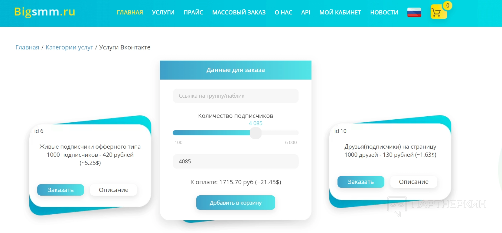 Можно просмотреть описание услуги, а можно сразу заказать ее. Во время оформления всплывет меню, где нужно указать данные — например, если выбрать услуги накрутки подписчиков, то нужно указать ссылку на паблик ВКонтакте и необходимое количество подписчиков. Потом сразу же сформируется итоговая стоимость.