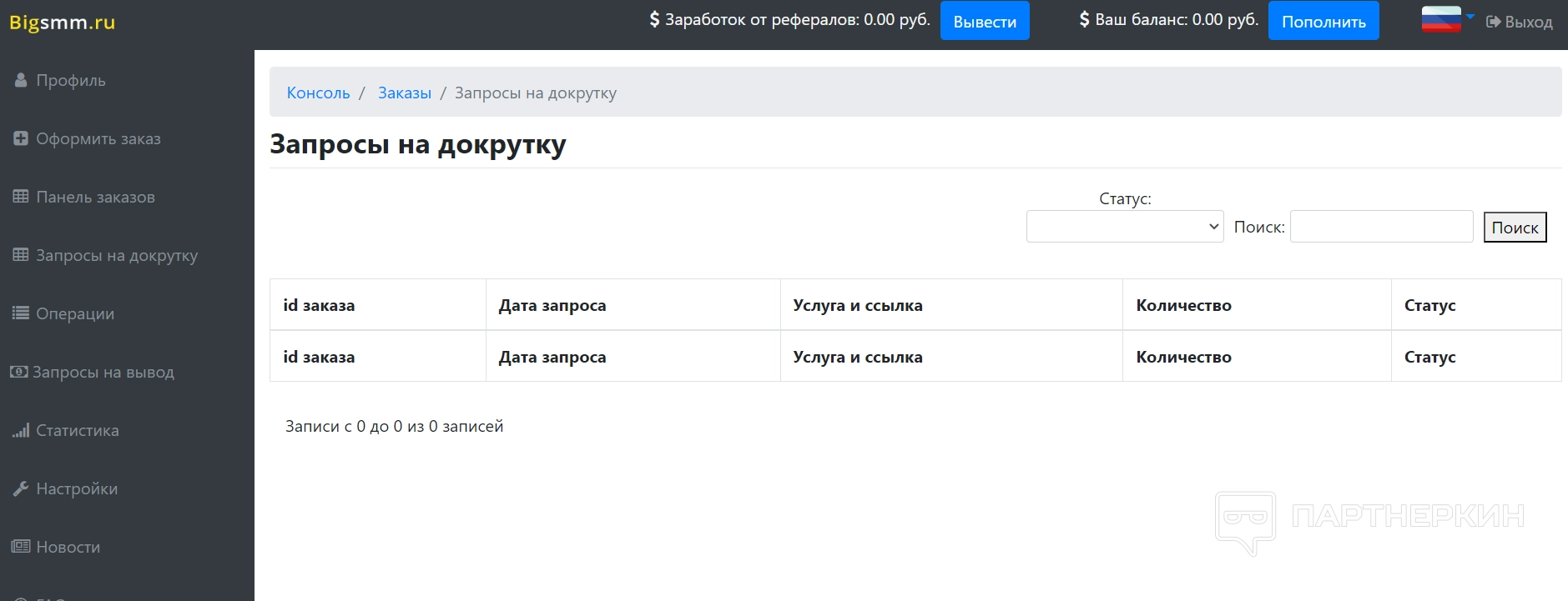 Из остальных интересных функций в кабинете можно выделить запросы на докрутку — это может быть полезно тем, кто уже оформил заказ, но количество действий или подписчиков недостаточно.