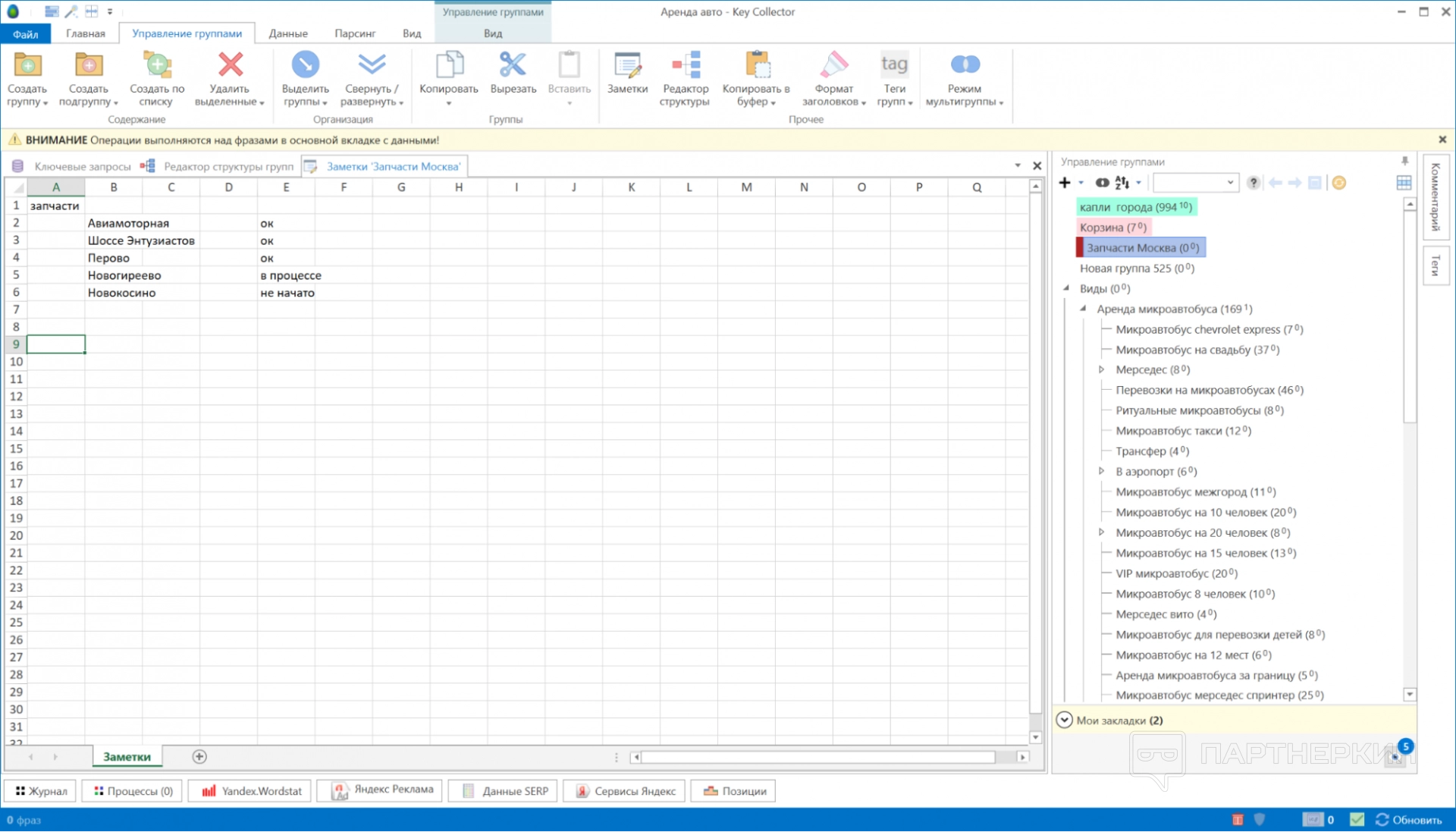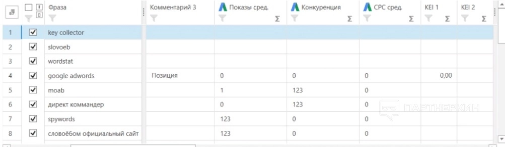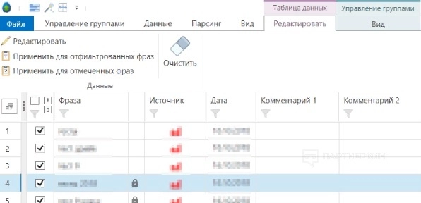 Специфика и логика работы с таблицами данных напоминает Excel. Эти таблицы показывает ключевые слова и фразы из выбранной активной группы. Каждая фраза появляется в отдельной строке, каждый столбец соответствует параметру или метрике статистики.