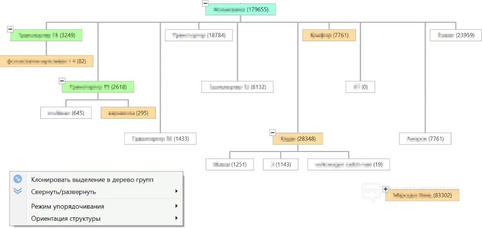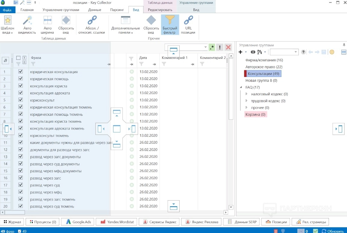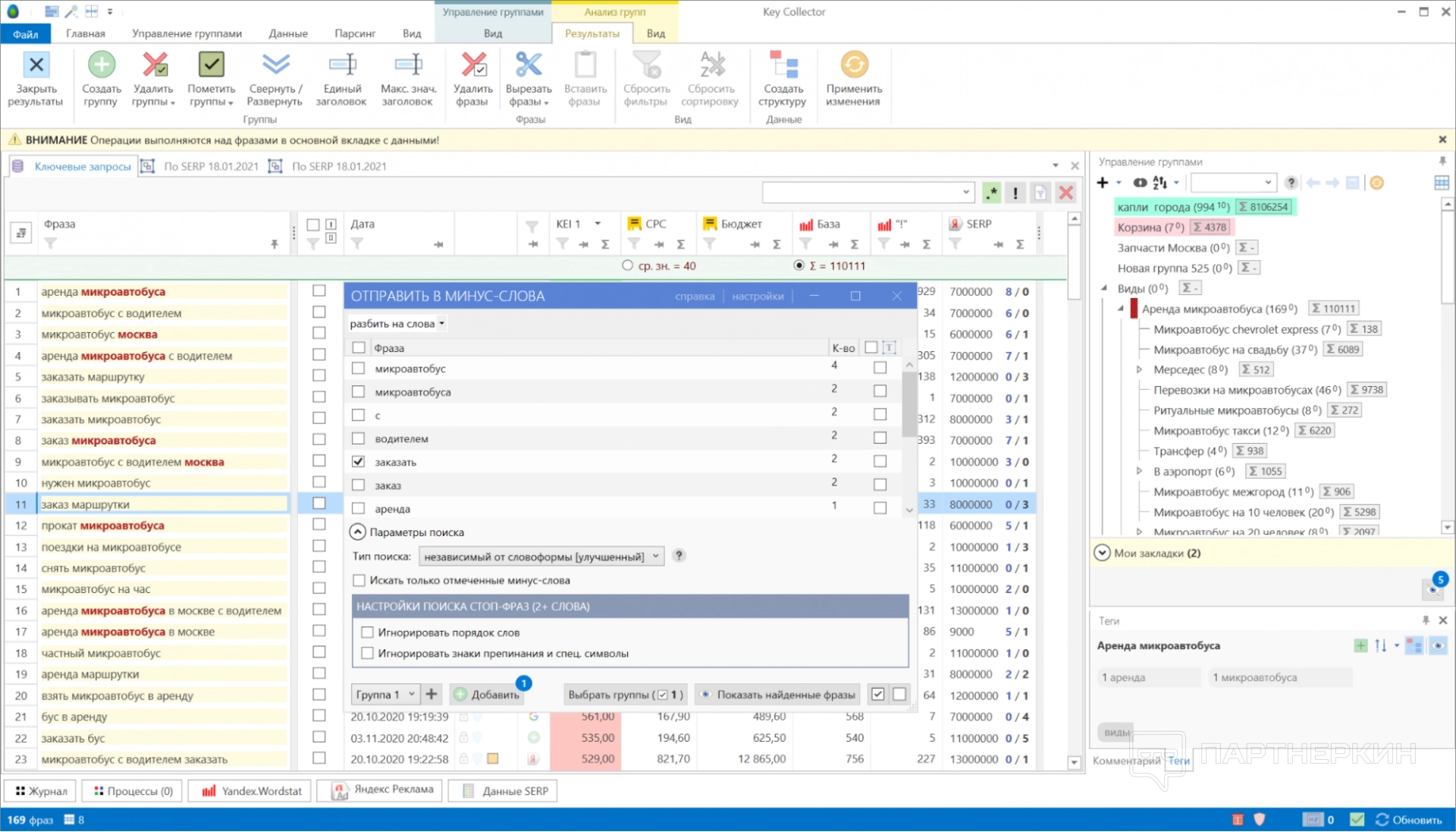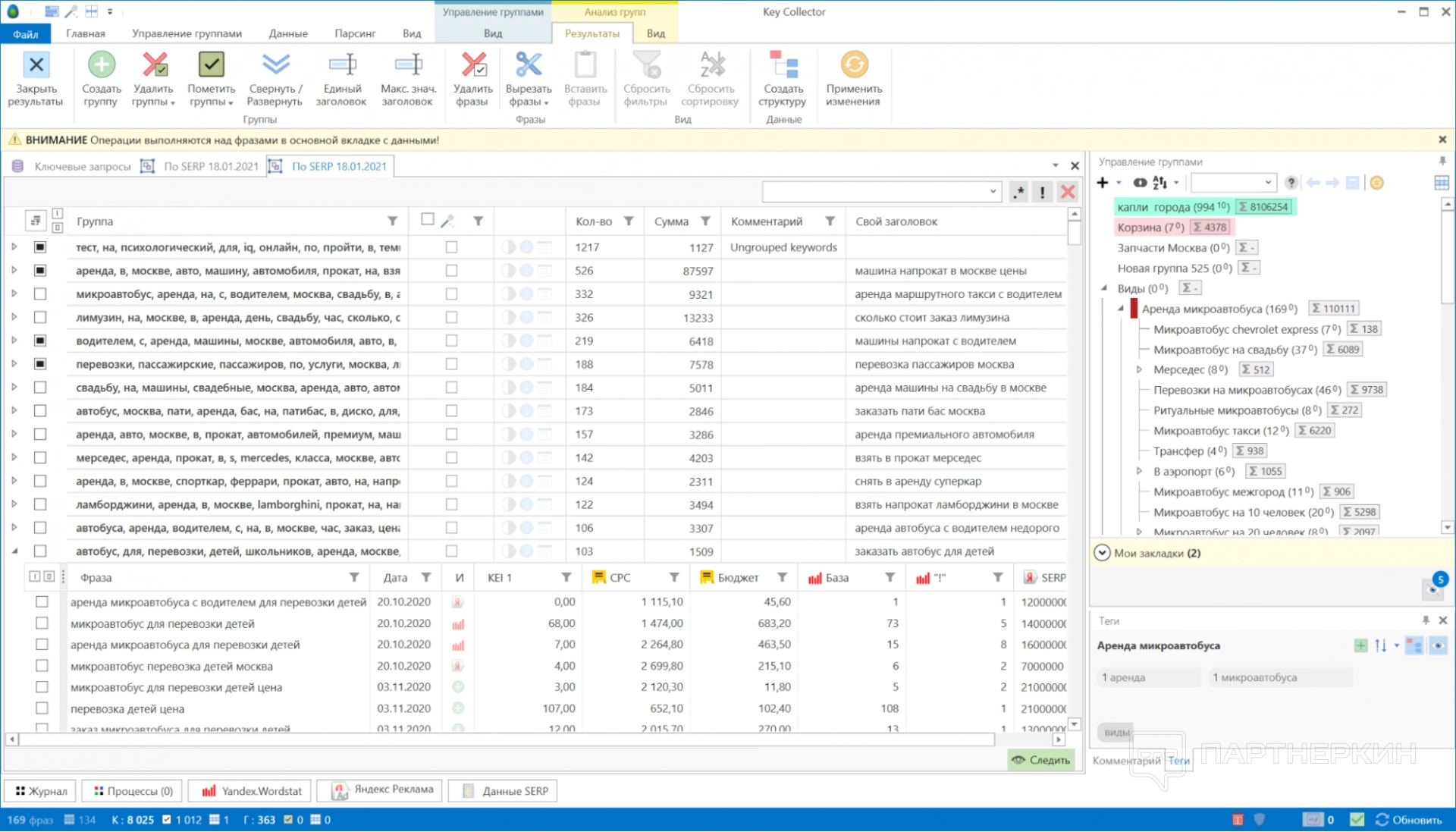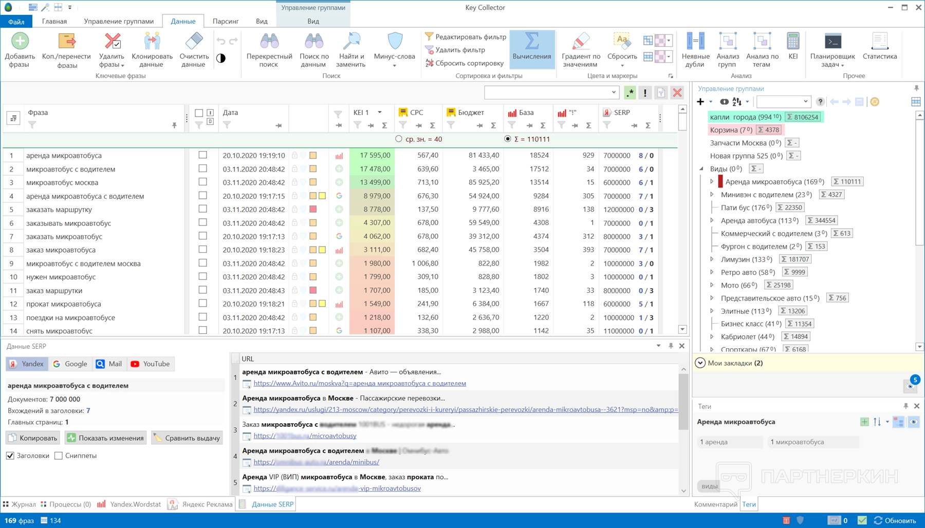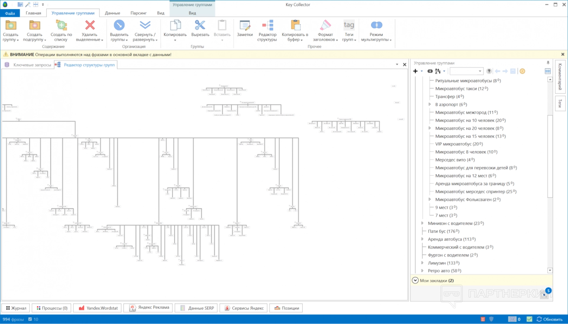 Если ядро достаточно объемное, программа помогает организовать запросы, упорядочить, кластеризовать. В автоматическом режиме можно использовать анализ групп, задавать правила, искать семантические связи. Полуавтоматический режим поддерживает систему тегов. Дерево групп обеспечивает навигацию и работу с созданной структурой.