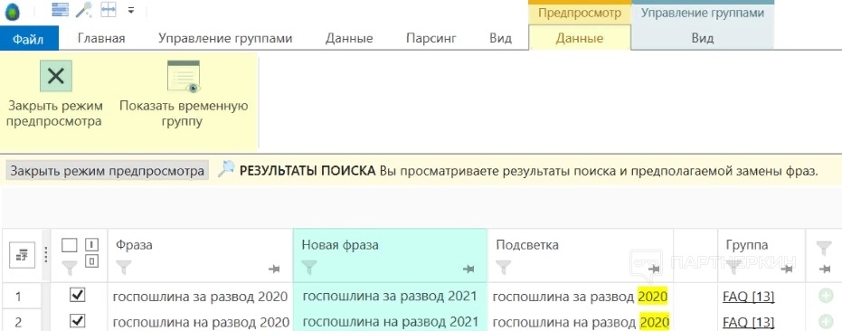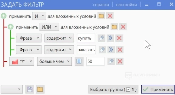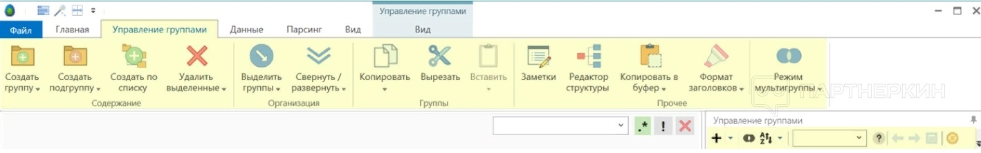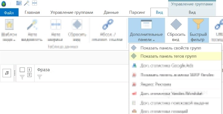 • Режим мультигрупп. Нужен, когда требуется посмотреть список фраз и параметров из нескольких групп, чтобы воспользоваться общим фильтром. Мультигруппа — временное представление информации, отображающее фразы из набора групп.