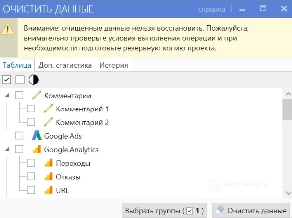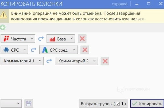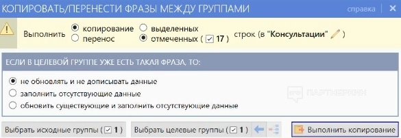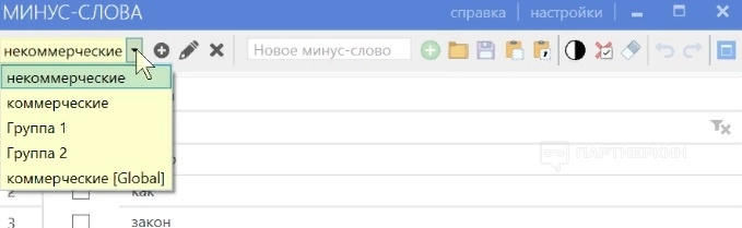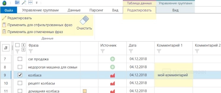• «Данные». Содержит опции для работы с ключевыми фразами.