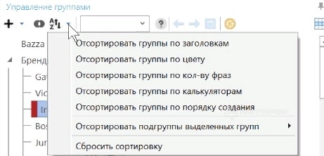 • Сортировка, фильтрация. Сортировать можно по тексту или цвету заголовка, по количеству фраз, порядку создания, по калькуляторам и сводным значениям параметров фраз.