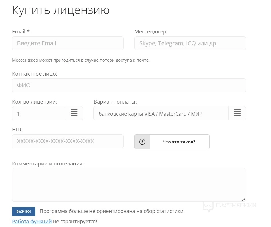 Для запуска нужна персональная лицензия. Она привязывается к конфигурации ПК, пользователь идентифицируется с помощью email. Чтобы приобрести лицензию, понадобиться перейти на страницу с покупкой, ввести свой email, контакты Skype или Telegram для экстренной связи, ФИО, выбрать вариант оплаты, ввести Hardware ID (HID или идентификатор ПК), указать комментарии и пожелания по необходимости.