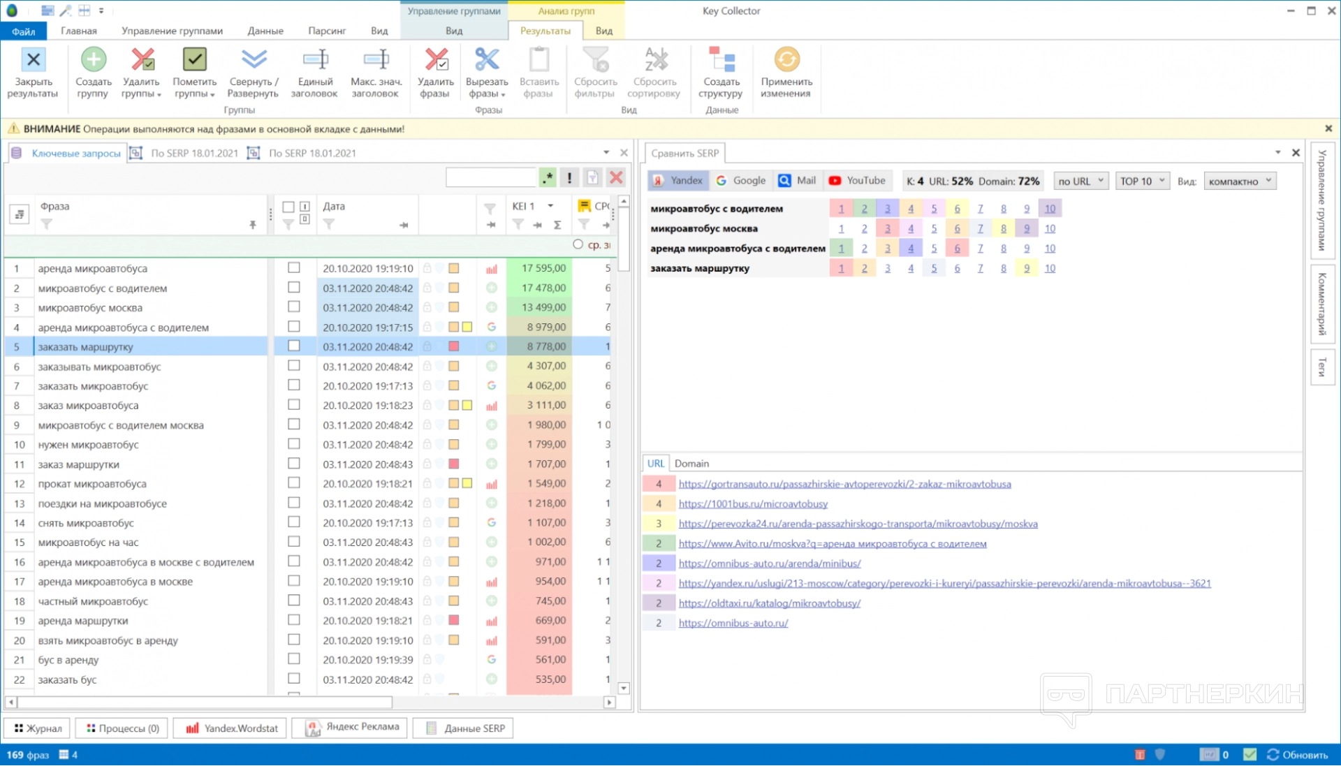 Есть поддержка сортировки, маркировки, закладок, автоматического и полуавтоматического анализа, других операций с данными и таблицами. Система фильтрации помогает работать с ключевыми фразами, формировать сложные запросы и выбирать наиболее оптимальные из них. Можно сохранять в шаблоны комбинации, использующиеся чаще всего, передавать их другим сотрудникам. Предоставляются модули для ручной и автоматической кластеризации, поиска дублей, минус-слов, стоп-слов.