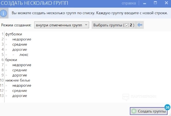 Например, в режиме распределения по группам можно задать группы для добавления результатов по каждому запросу. Автоматическое распределение нужно, когда набор фраз известен заранее, но группы еще не созданы.