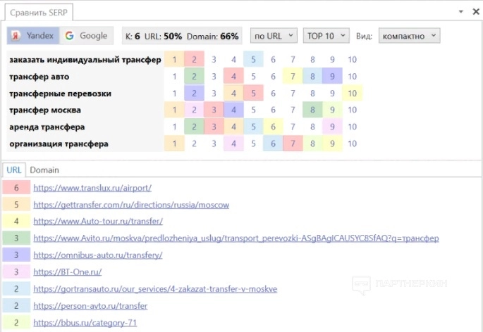 • Сравнение поисковой выдачи. Происходит по нескольким запросам.