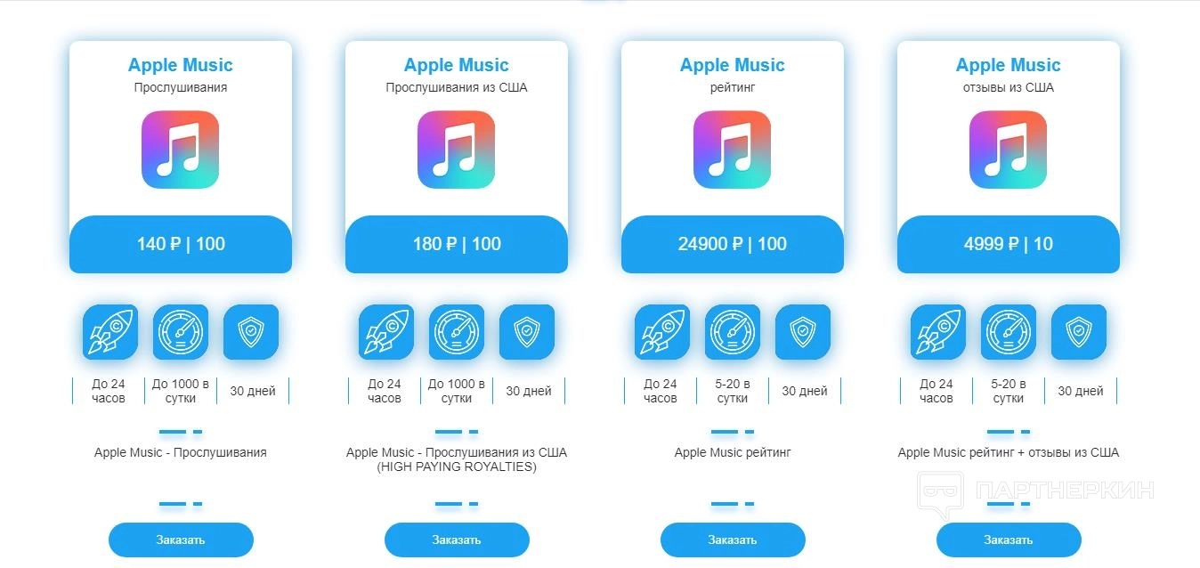 На платформе можно заказать услуги, связанные с продвижением музыкальных групп и исполнителей. Доступна накрутка прослушиваний в ВК, SoundCloud и Spotify, а также оценки и скачивание треков в Apple Music. Также можно накрутить количество прослушиваний подкастов в iTunes Store.