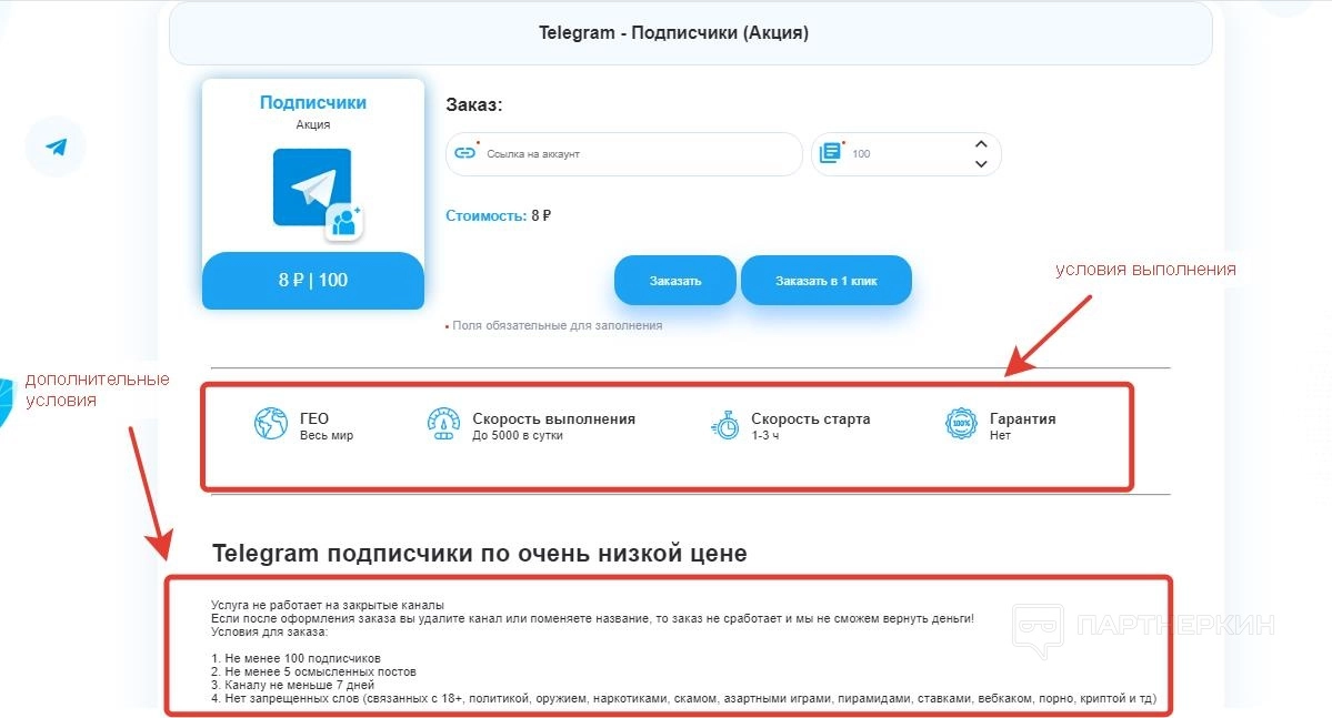 Не забудьте прочитать условия выполнения – здесь может быть указана информация, из-за которой вам могут отказать в выполнении. Например, обычно запрещается продвигать приватные паблики и закрытые группы.