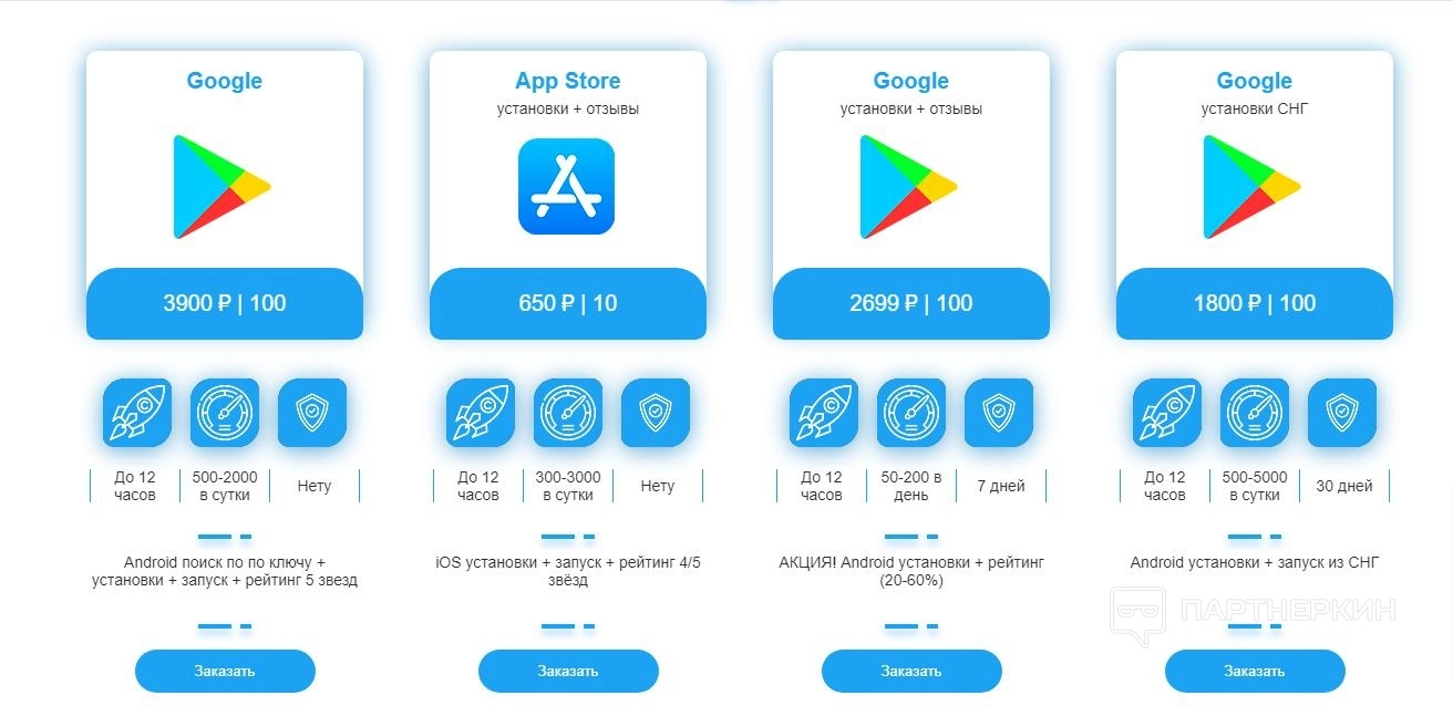 Сервис предлагает покупку комментариев и положительного рейтинга в магазине приложений Google Play и App Store. Поддерживается пакет «Установка + Отзывы», можно выбирать загрузки из разных стран (СНГ, Россия, Беларусь, Испания, США, Казахстан и другие страны). Среди других услуг – установка и запуск, накрутка жалоб, продвижение по ключевому запросу.