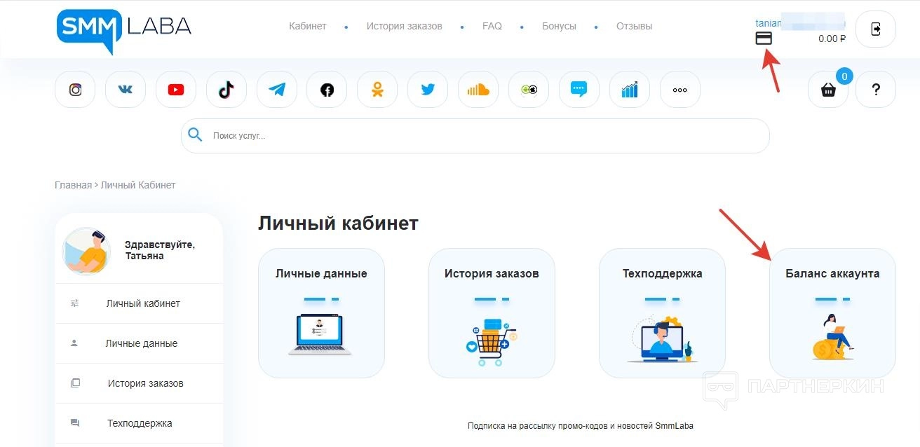 Перед тем, как совершить покупку на сайте, требуется внести на личный баланс денежные средства. Для этого кликните по иконке карты под вашим логином или перейдите в раздел «Баланс аккаунта» в личном кабинете.