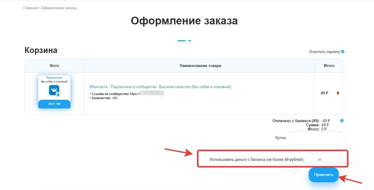 Нажмите «Заказать», чтобы подтвердить действие. Услуга переместится в список покупок. Перейдите в корзину и подтвердите заказа. Если у вас есть средства на счету, отметьте строку «Использовать деньги с баланса» и нажмите «Применить». После этого подтвердите действие, нажав «Оформить заказ».