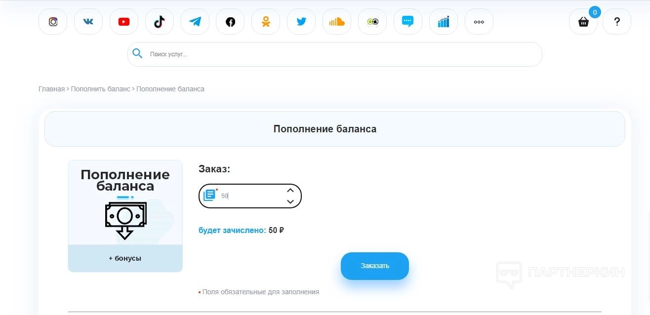 На платформе фактически отсутствует минимальный размер пополнения, но все же рекомендуется вносить не менее 20 рублей. Укажите нужную сумму в соответствующее поле и нажмите «Заказать». Сервис покажет, сколько по факту будет зачислено на счет.