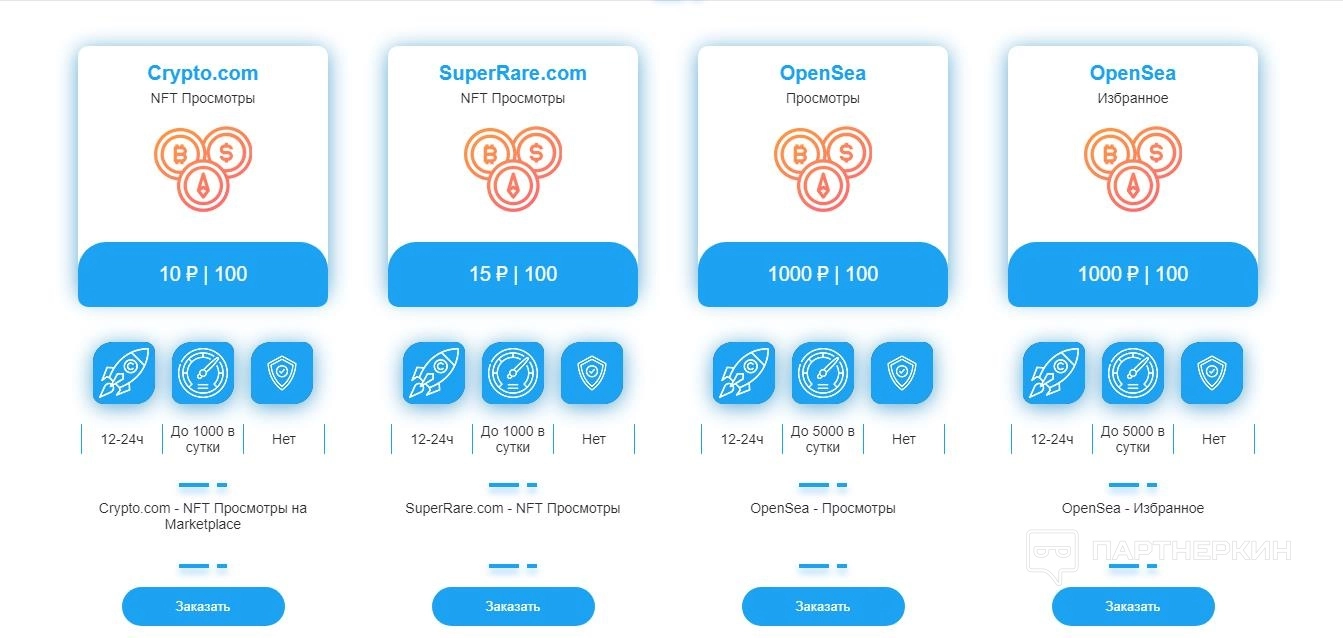 Используя возможности платформы, можно заказать просмотры NFT-проектов, что способно поднять их стоимость. Также клиенты могут накрутить подписчиков, лайки, занесение в избранное, вывод в тренды, накрутку голосов и другие услуги, способствующие популярности на крипто-сайтах.