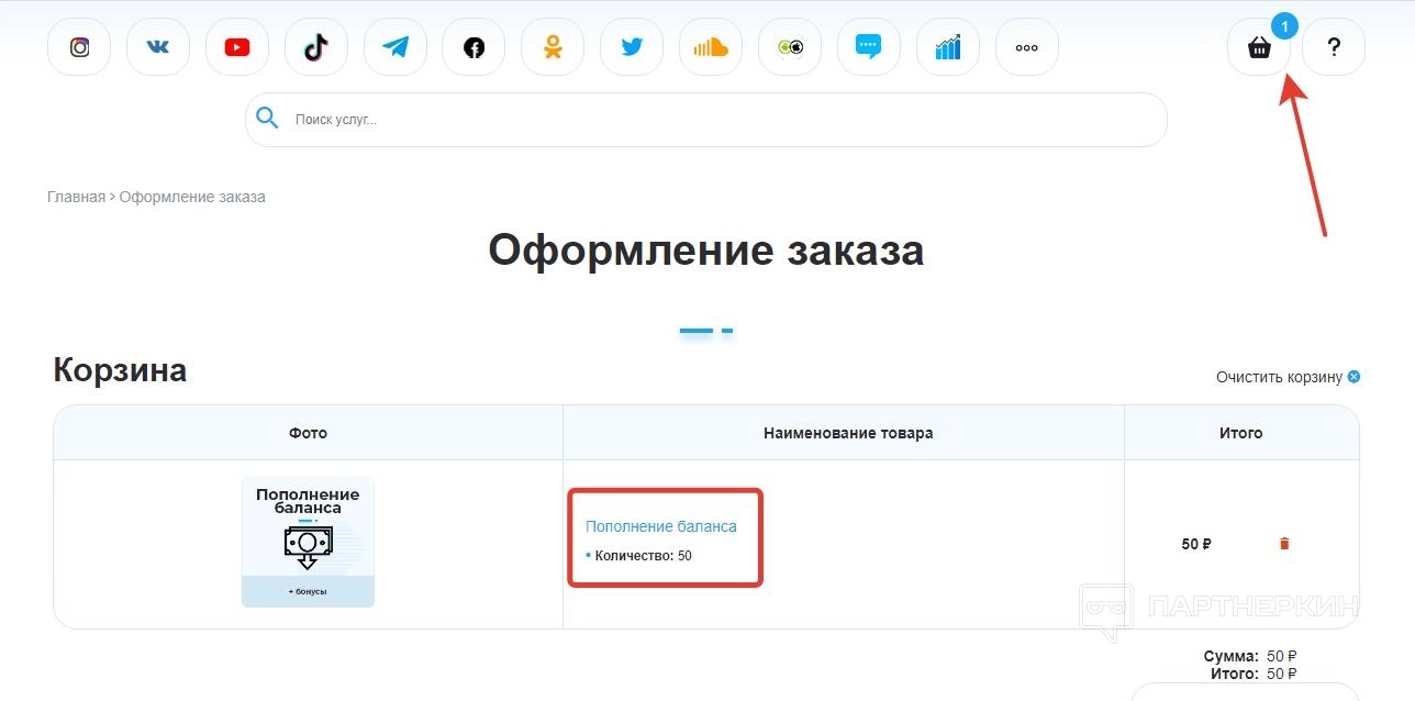 Сервис рассматривает пополнение баланса как услугу, поэтому после нажатия кнопки «Заказать» он перемещается в список покупок. Чтобы продолжить операцию, щелкните по иконке корзины в правом верхнем углу. Откроется список заказанных услуг, среди которых будет указано «Пополнение баланса».