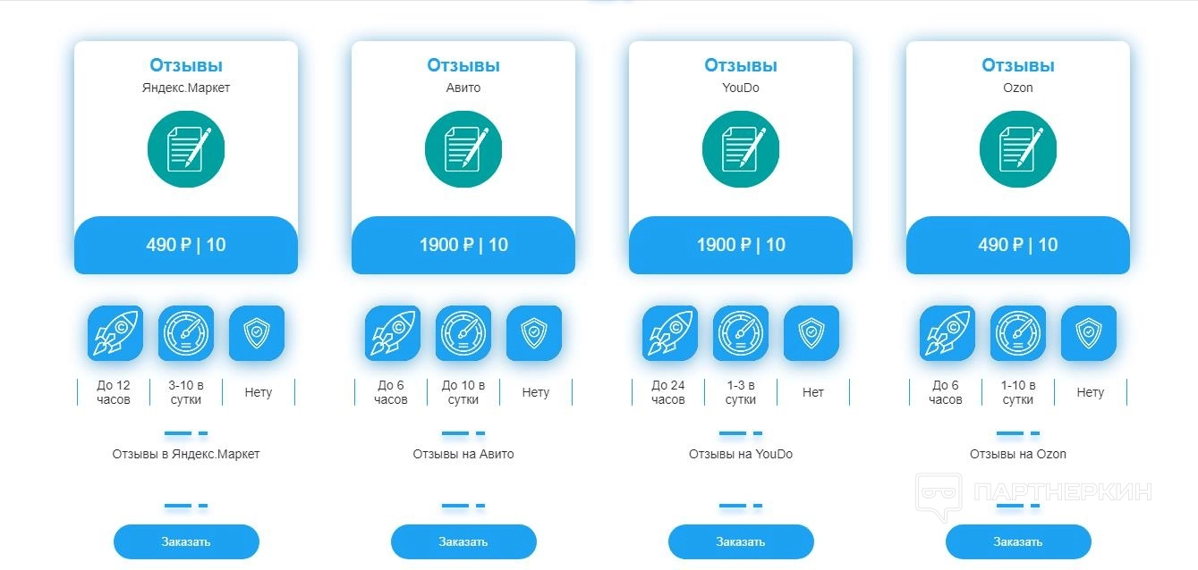 Сервис предоставляет услуги по управлению репутацией компании и повышения доверия к бренду. Для этого можно заказать отзывы на популярных площадках вроде Отзовик, а также купить обзоры для товаров на Яндекс Маркете и других маркетплейсах.