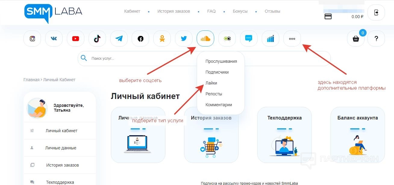 SMMLaba поддерживает огромное количество социальных платформ, от популярных социальных сетей до нишевых сайтов. В списке доступных площадок – ВКонтакте, Instagram*, Facebook*, YouTube, Soundcloud, Spotify, Одноклассники, Yappy, Only Fans, Club House, Twitter, Discord, IMDB, Quora, Snapchat и множество других сайтов.