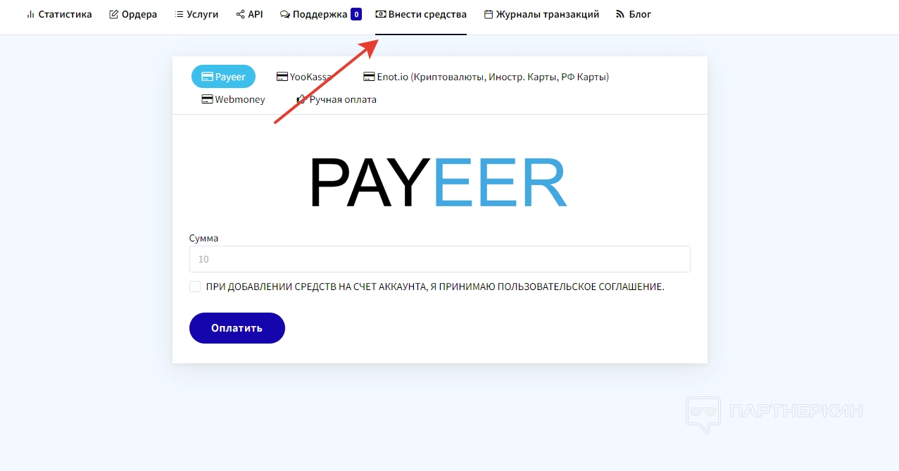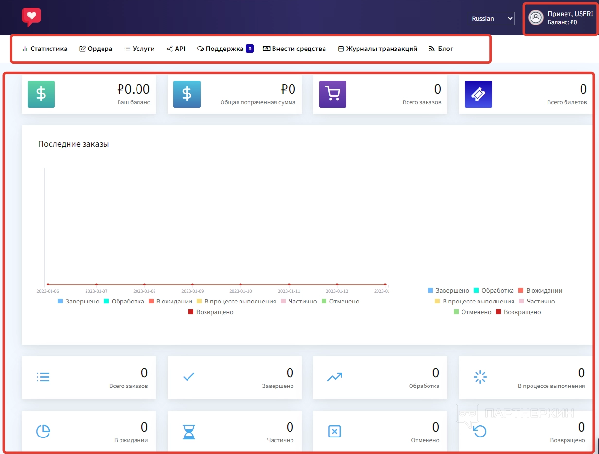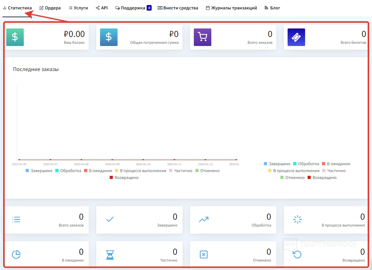 Панель управления состоит из 9 разных разделов. Первым является «Статистика», в котором отображаются все важные для аккаунта сведения. Здесь можно найти инфу по текущему балансу и потраченным средствам. Есть данные о количестве заказов, которые разделяются по статусам: