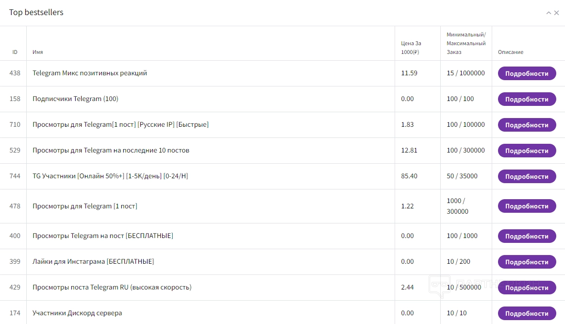 В нижней части экрана отображается список топовых заказов для разных социальных сетей, которые размещаются владельцами групп и каналов. Заказы отсортированы по цене, минимальному/максимальному количеству и описанию.