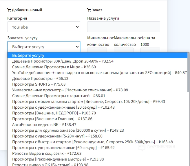 Далее выбирает тип задания. Например, для YouTube сервис предлагает: