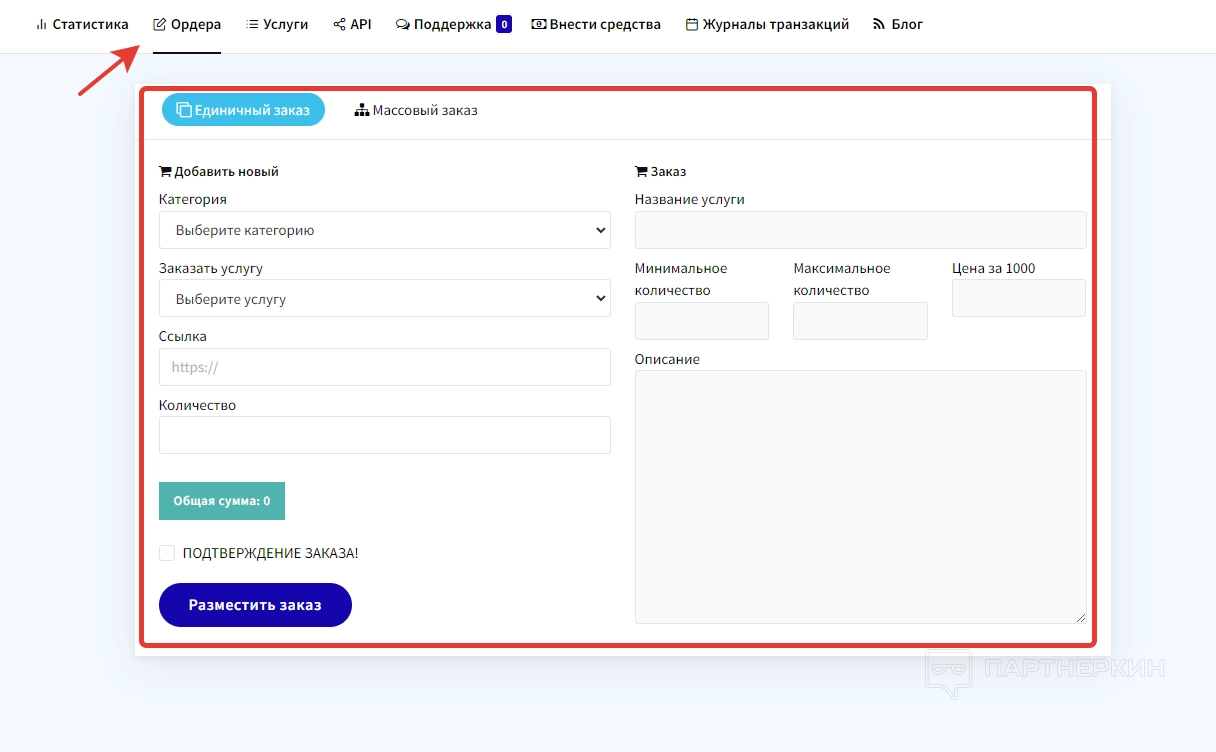 В первую очередь выбираем сервис, для которого размещается ордер. На момент написания статьи поддерживались: