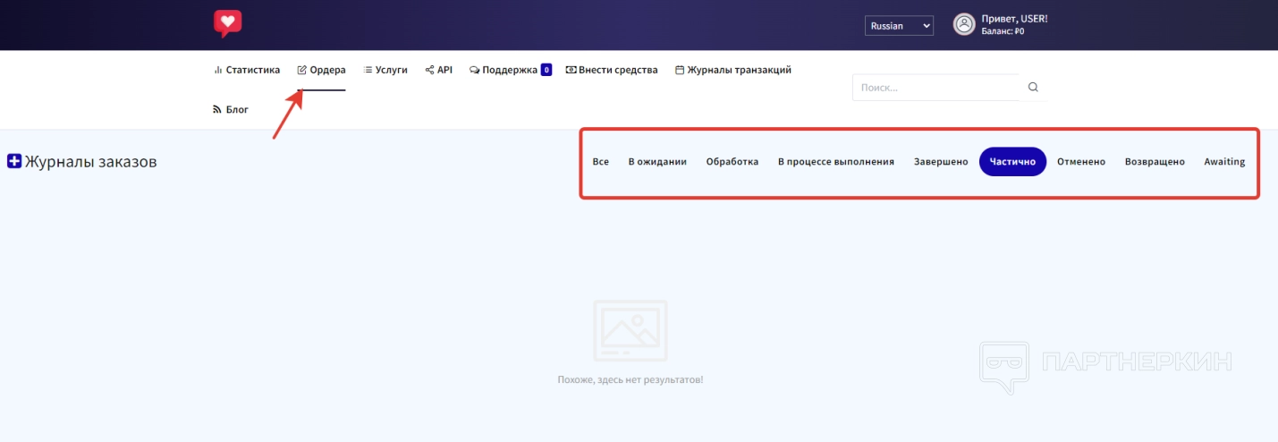 Во вкладке «Журналы заказов» отображаются все созданные в учетной записи ордеры. Чтобы работать с ними было проще, система фильтрует задания по следующим статусам: