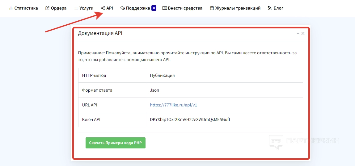 Далее идет раздел «API», где находится вся необходимая документация, а также URL-адрес и ключ API.