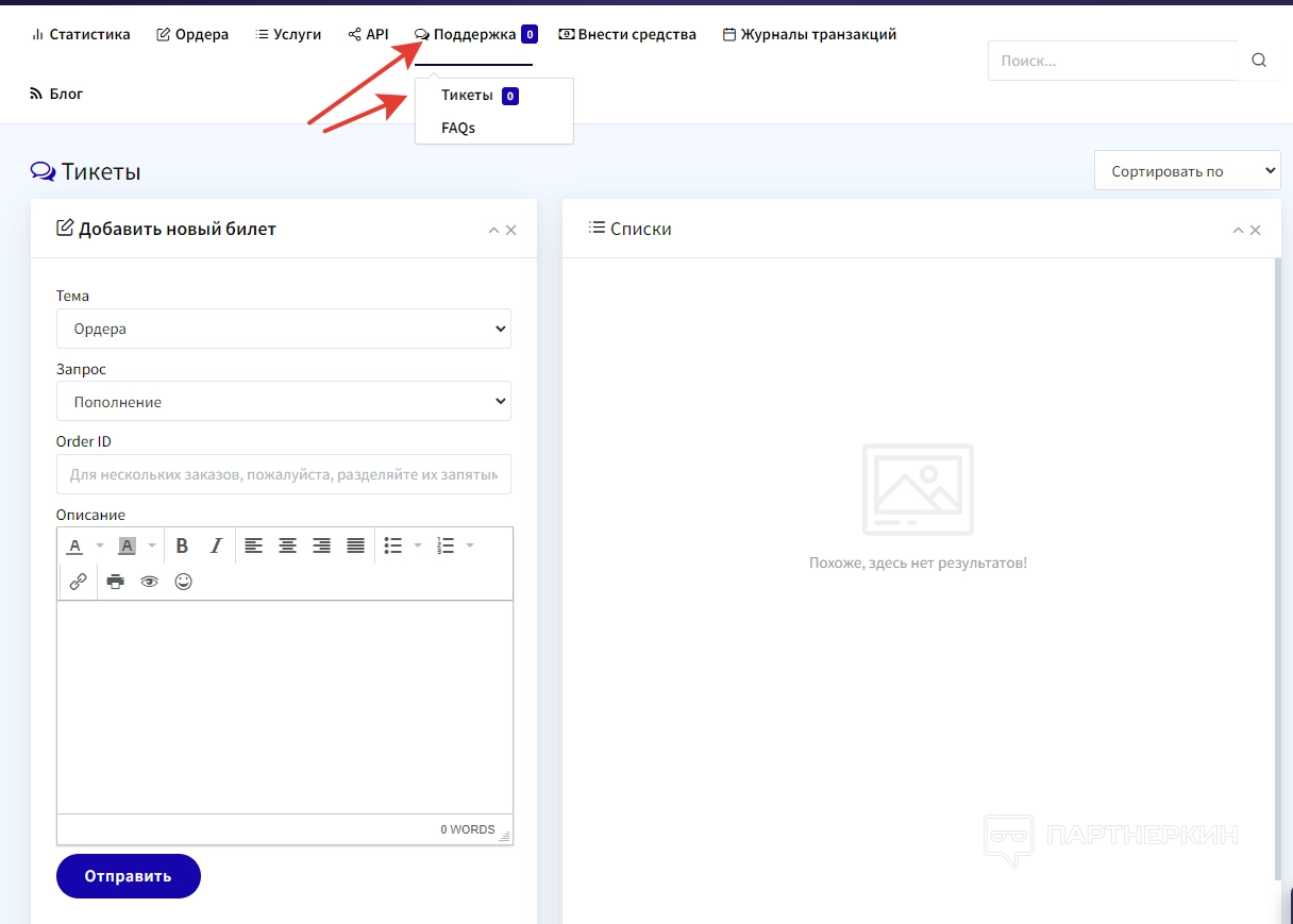 В разделе «Поддержка» пользователь может обратиться к сотрудникам службы техподдержки. Для этого кликаем на вкладку «Тикеты» и заполняем специальную форму, где нужно указать тему, запрос и составит описание.