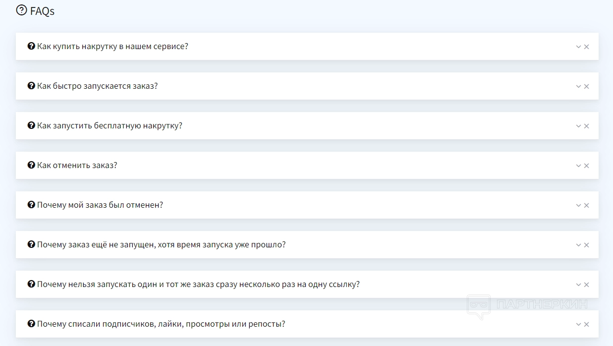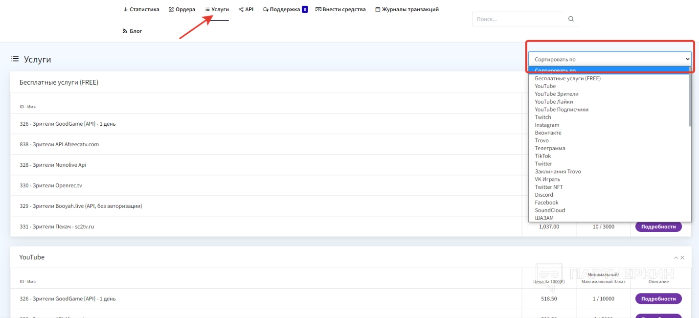 Следующий раздел в панели управления — «Услуги». Здесь отображаются все созданные ордеры владельцами разных пабликов, страничек и каналов, которые тоже зарегистрированы в