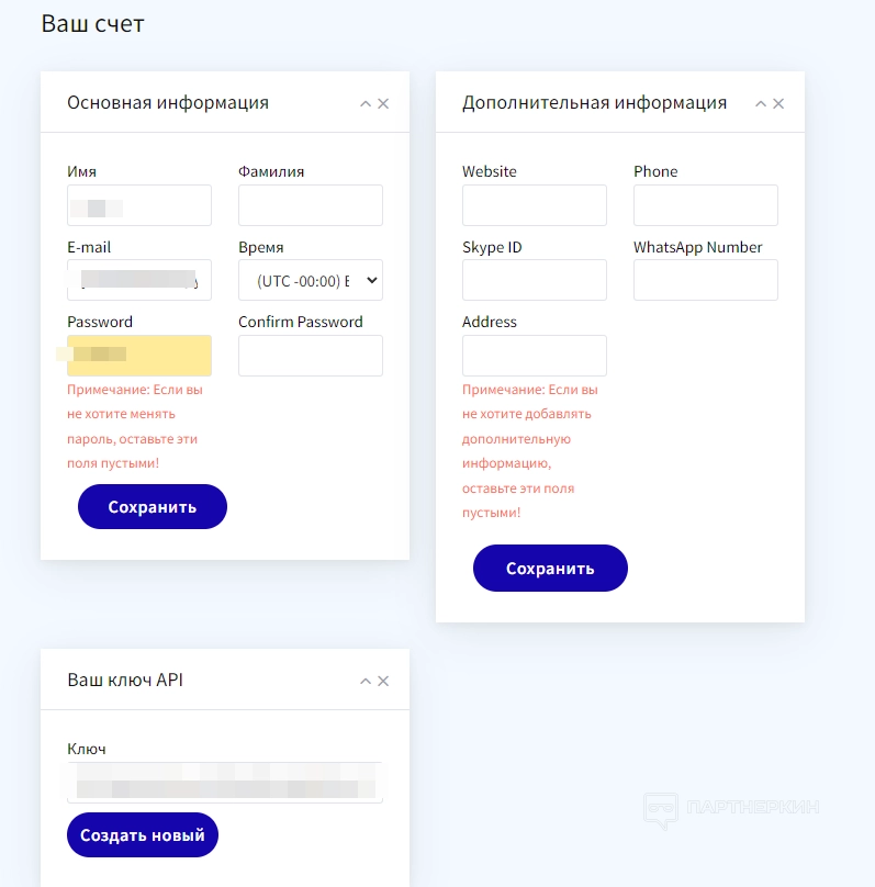 - основная информация — здесь меняется имя, фамилия, почта, пароль и часовой пояс;