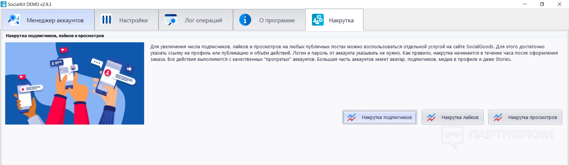 Все возможности выше касаются именно работы с аккаунтами, их анализом и подбором аудитории. Но у программы есть и другое направление — это продвижение аккаунтов. Конечно, продвигаться можно и через раздел задач — использовать масслайкинг или массфоловинг. Но эта стратегия работает слабо. Поэтому в приложении можно также воспользоваться накруткой.