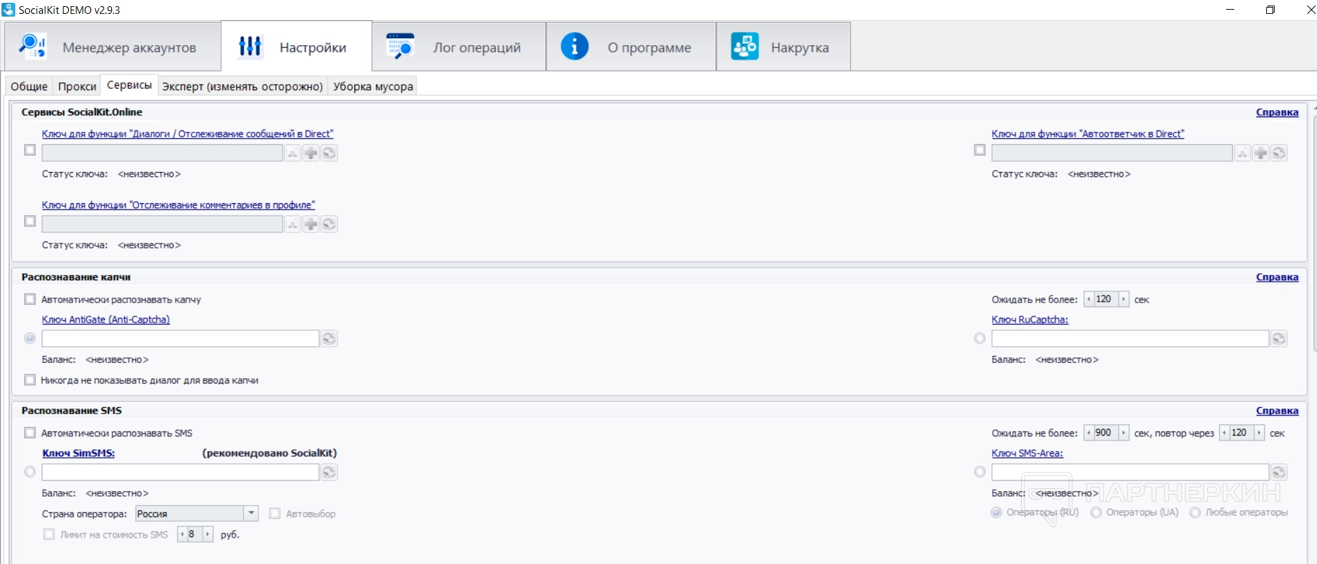 Настройки — это довольно запутанный раздел, в котором можно настроить работу программы. Например, пользователь здесь может настроить прокси, а также через API-ключ подключить различные сервисы для интеграции.