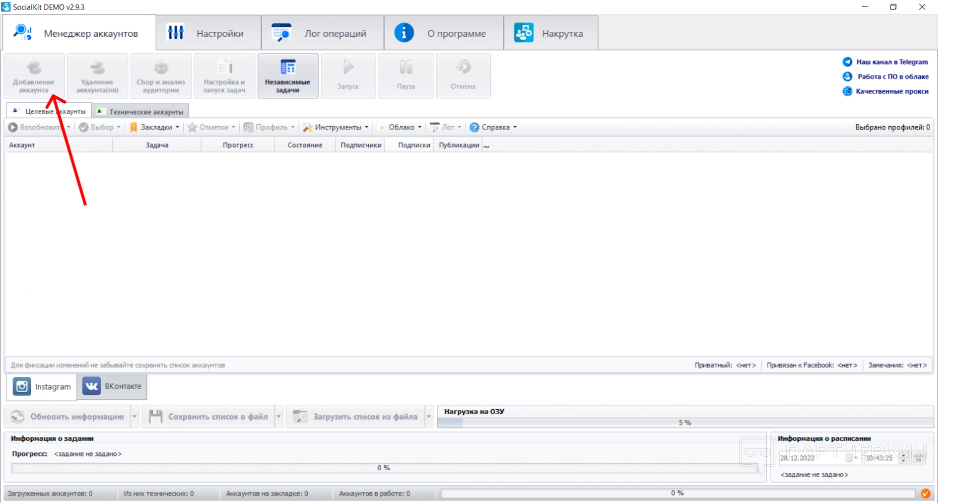 После установки программы, можно сразу начинать работу с ней. Для этого придется добавить аккаунты Вконтакте или Инстаграм*. Чтобы это сделать, нужно ввести данные логина и пароля от аккаунта, указать параметры почты и прокси.