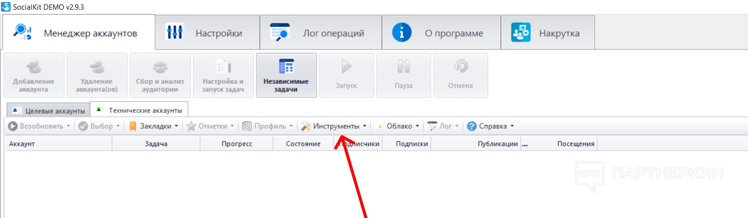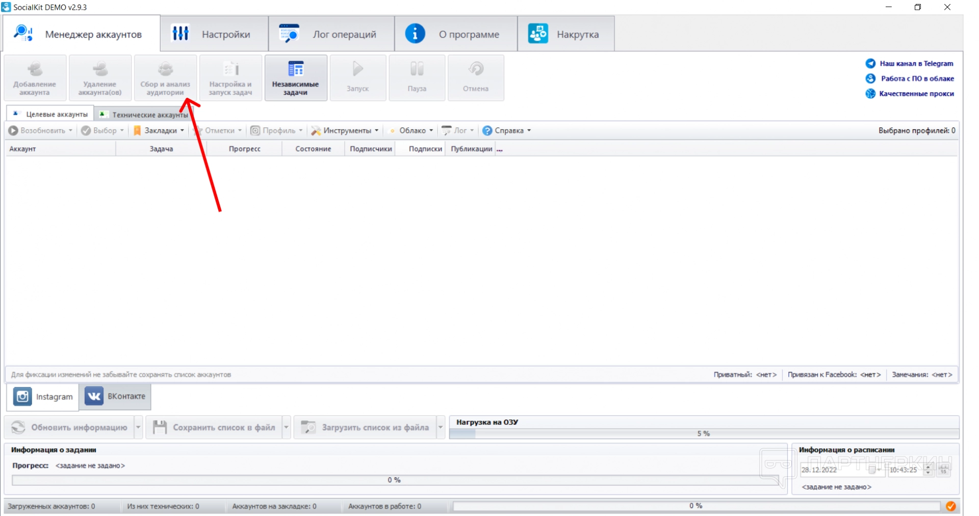 Каждую задачу, которую запустил пользователь, можно поставить на паузу или запустить повторно, а также полностью ее отменить по необходимости. Список всех задач будет отображаться в поле внизу — там будет показываться состояние задачи, ее прогресс, а также характеристики по количеству подписчиков, посещений, подписок и публикаций.