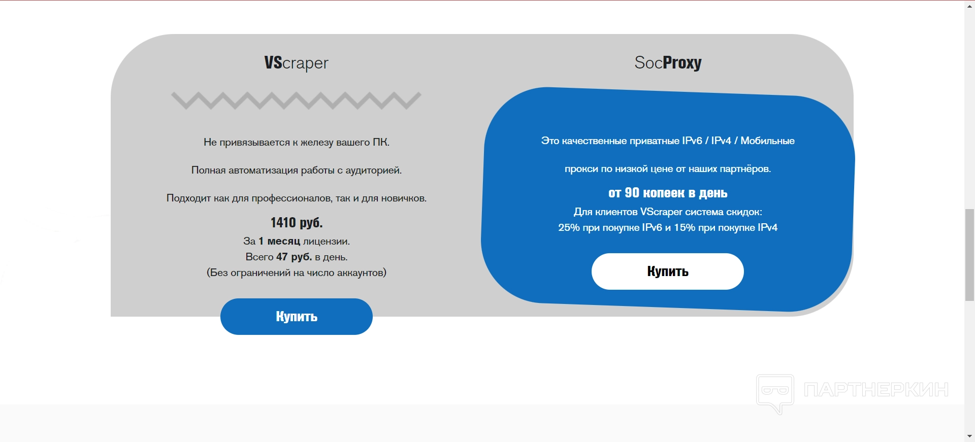 Также сам сервис предлагает в дополнение к основной программе использовать и другие — например, ToTop Tool для раскрутки аккаунтов в Тик Токе, а также VScaper, который заточен именно под продвижение аккаунта Вконтакте. Чтобы использовать программы эффективней, сервис предлагает и прокси по низкой цене от партнеров — около 90 копеек в день, при этом есть скидки в 25% и 15% при покупке конкретного прокси.
