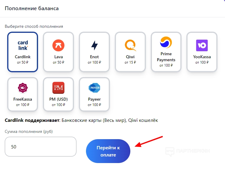 - Cardlink (от 50 ₽);