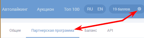 Чтобы получать дополнительный пассивный доход на VKMix, вы можете заняться привлечением рефералов. Для этого кликните на шестеренку в верхней части сайта и перейдите в раздел «Партнерская программа».
