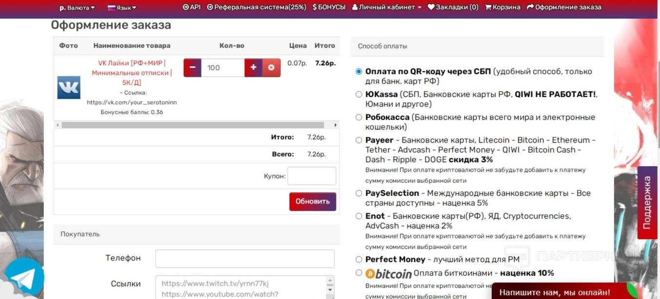 Что касается стоимости работ, то они варьируются в зависимости от установленных параметров, качества выбранного инструмента и так далее . Каждый пользователь может выбирать между несколькими вариантами и оплачивать понравившийся. В среднем накрутка того или иного показателя начинается от 0,02 RUB за 1 единицу измерения (лайк, подписчик, комментарий, просмотр и другие). Оплата принимается в рублях, долларах, евро, гривнах и фунтах стерлингов. Сам сервис поддерживает как большинство популярных способов оплаты, среди которых есть банковские карты, электронные кошельки и криптовалюта, так и множество мировых языков. Это упрощает работу с сайтом для иностранных граждан и расширяет список достоинств сервиса в целом.