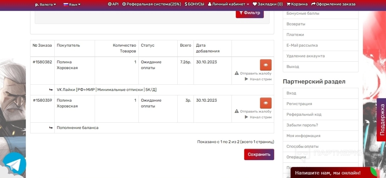 Стоит отметить, что в упомянутом разделе будут отображаться все заказы, вне зависимости от их статуса оплаты и выполнения. Например, если пополнение баланса или заказ на накрутку не были оплачены, эти данные будут отображаться на странице до момента оплаты. Пока пользователь этого не сделает, сервис предоставлять услугу не станет.