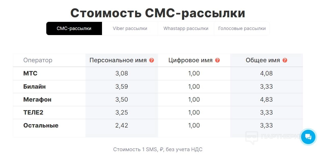 Общая цена тарифа рассчитывается в зависимости от мобильного оператора и выбора персонального имени. Оплата взимается за каждое отправленное сообщение.