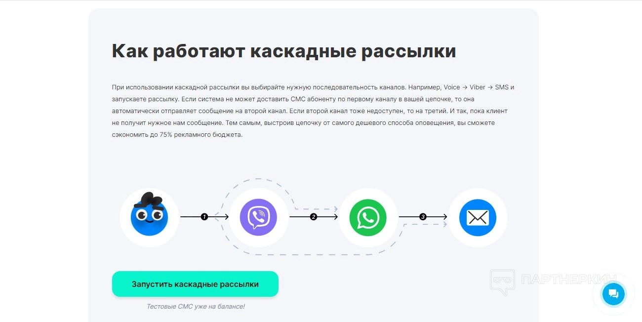 Каскадные рассылки помогут убедиться, что абонент получил важное сообщение даже при форс-мажоре. При выборе этого режима сервис сначала отправляет стандартные СМС, а если этот тип связи выведет ошибку, запустит цепочку на все доступные каналы: голосовые сообщения и уведомления в мессенджерах.