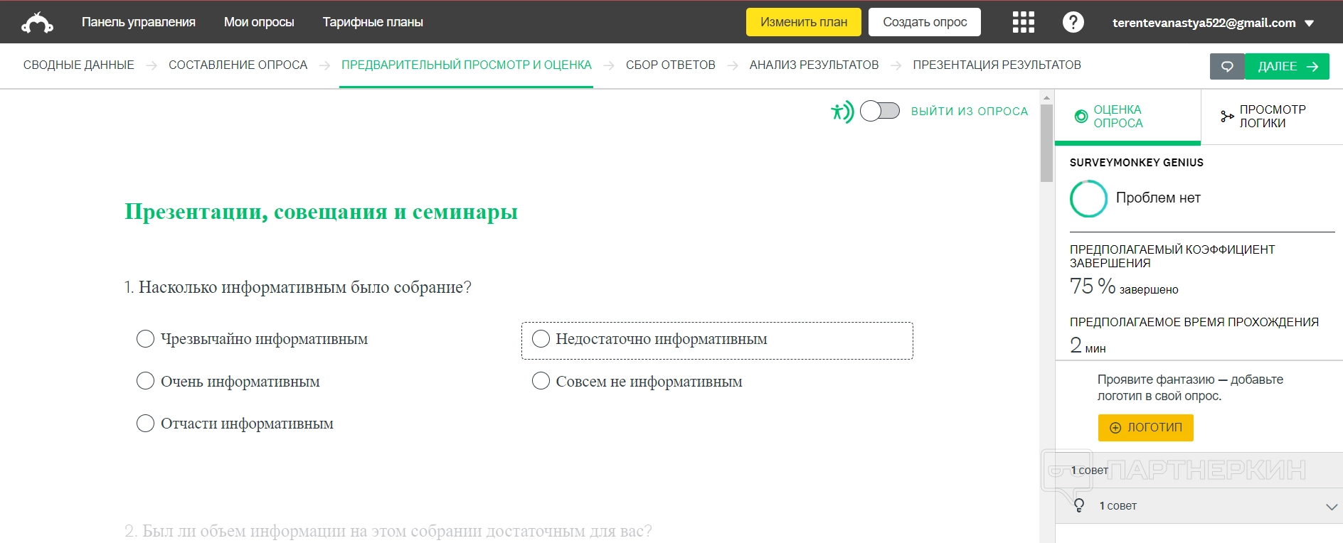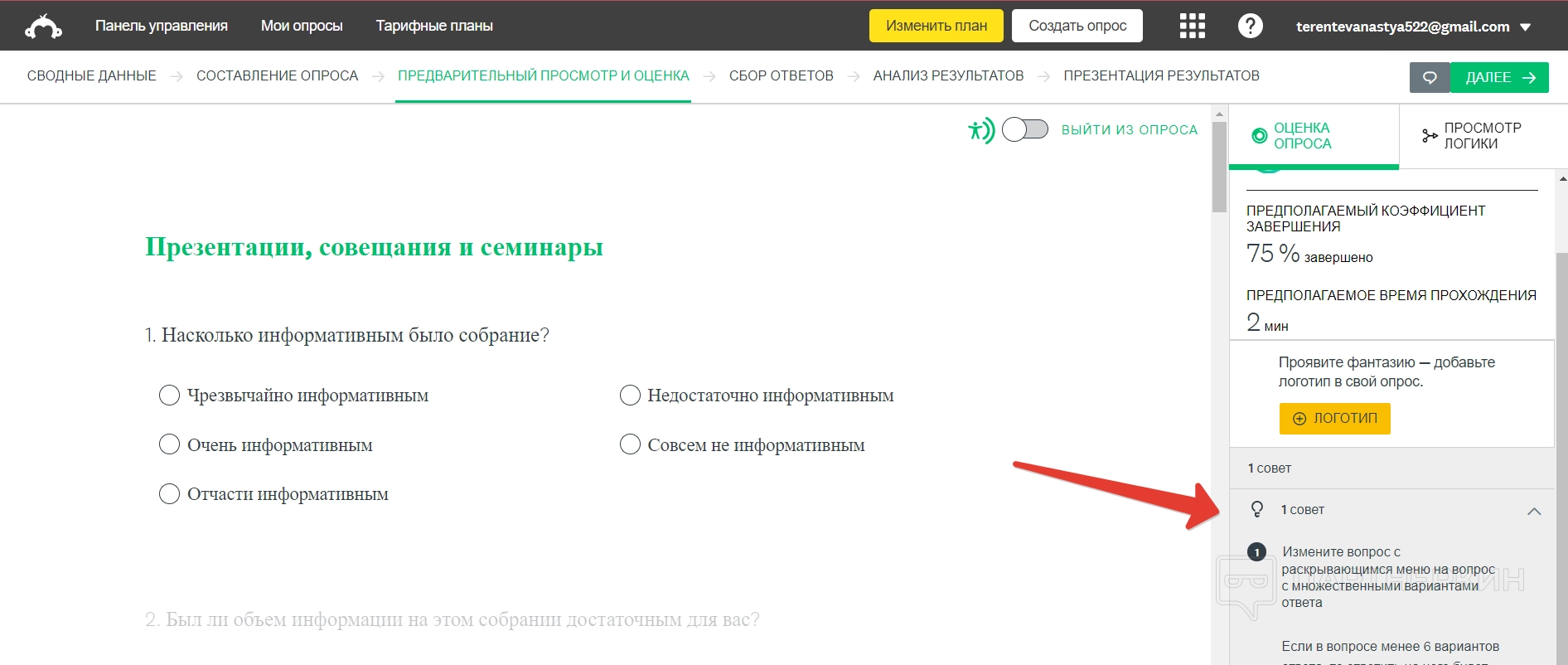 На скриншоте видно, что показывается сама страница с опросом, а также сводные данные по нему. Там пользователи могут увидеть, какой примерно у опроса процент вероятного завершения и сколько времени отнимет его прохождение. Также можно посмотреть советы от системы, которые улучшат качество опроса.