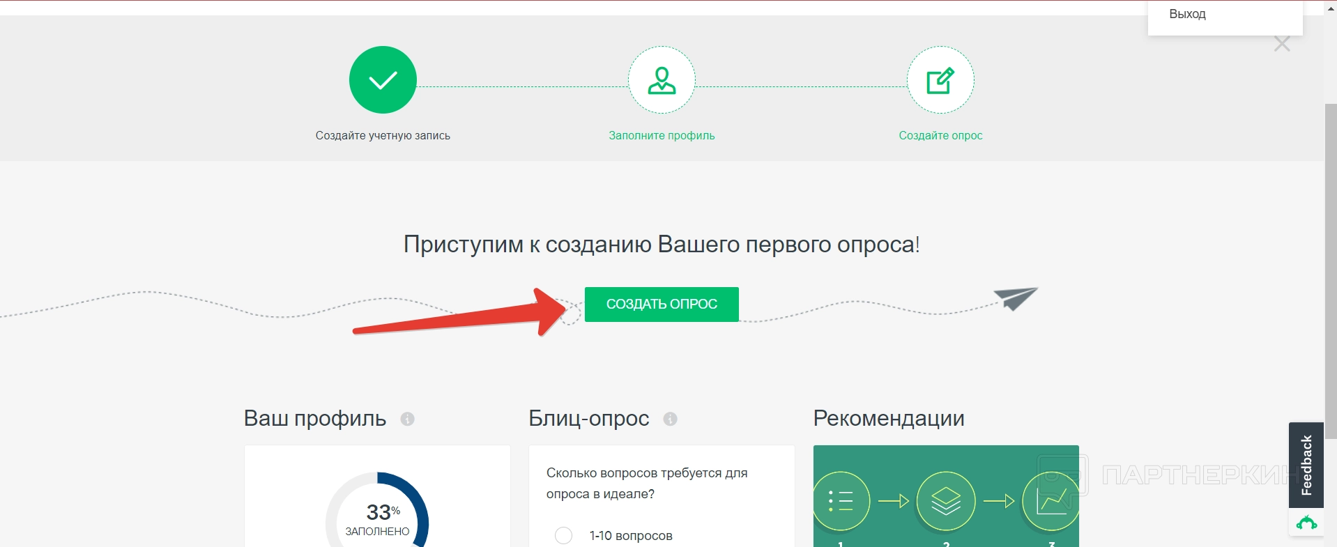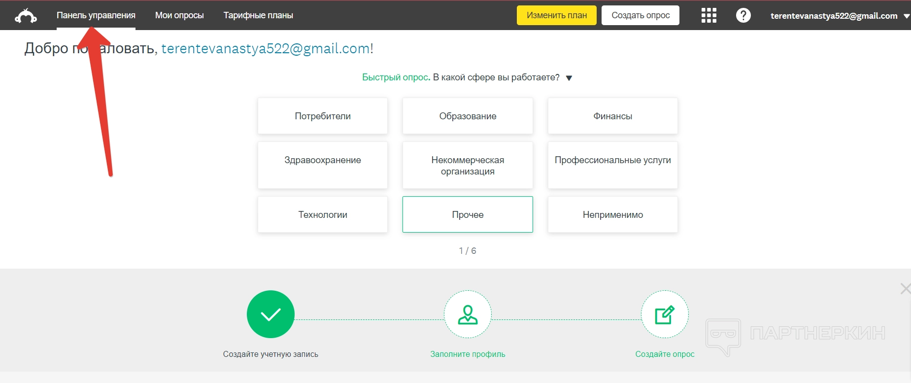 Чтобы начать создание опроса, нужно перейти в панель управления — соответствующая кнопка находится вверху страницы.