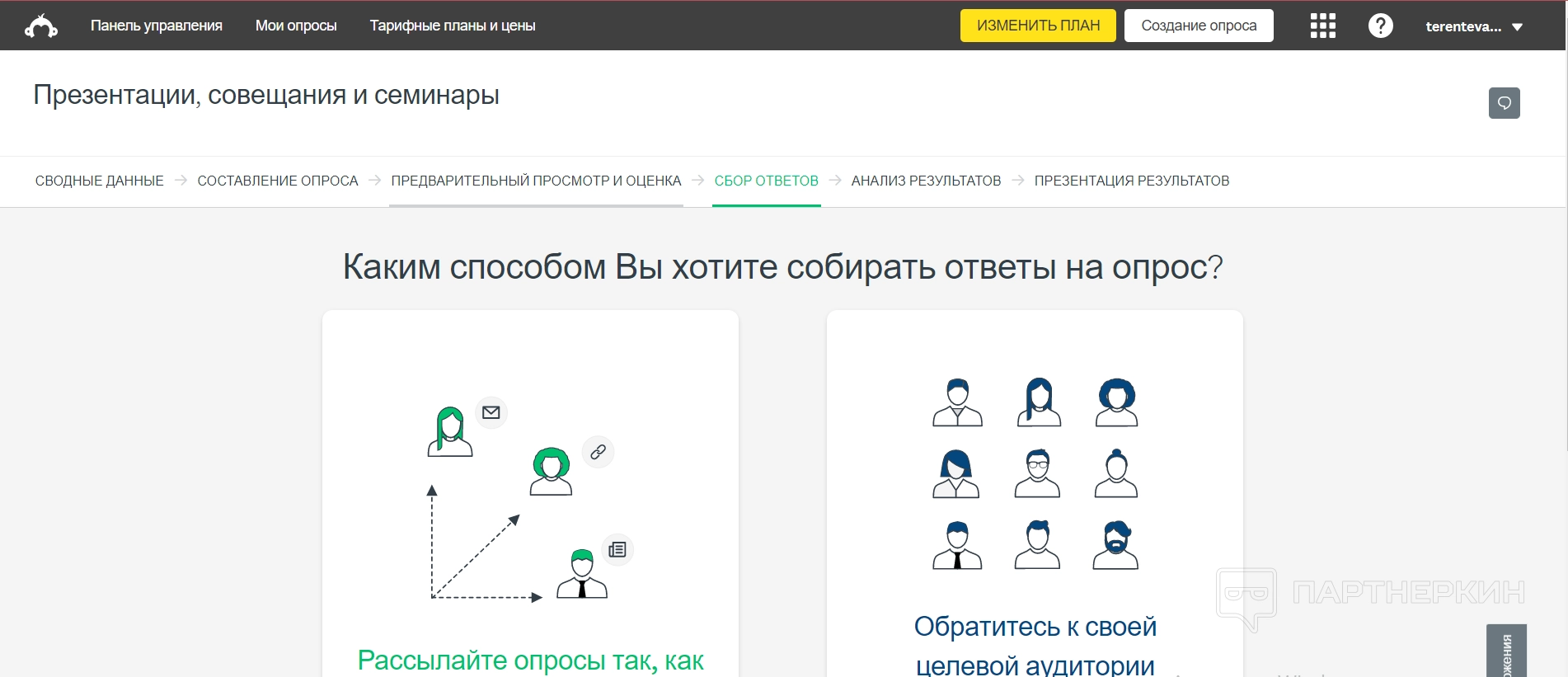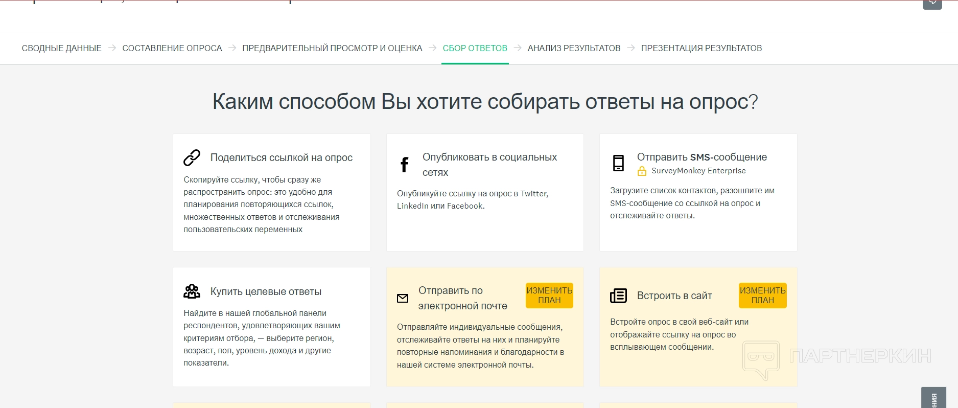 Сбор ответов — в этом разделе можно настроить то, как будет происходит сбор ответов. Если пользователь планирует проводить его среди уже подготовленных респондентов, то он выбирает вариант рассылки. Если же ему нужны респонденты для опроса, например, в случае сбора каких-то статистических данных среди целевой аудитории, то он может запросить помощь у сервиса. Тогда система будет сама собирать ответы на вопросы среди нужных демографических групп, и после сбора отправит их пользователю.