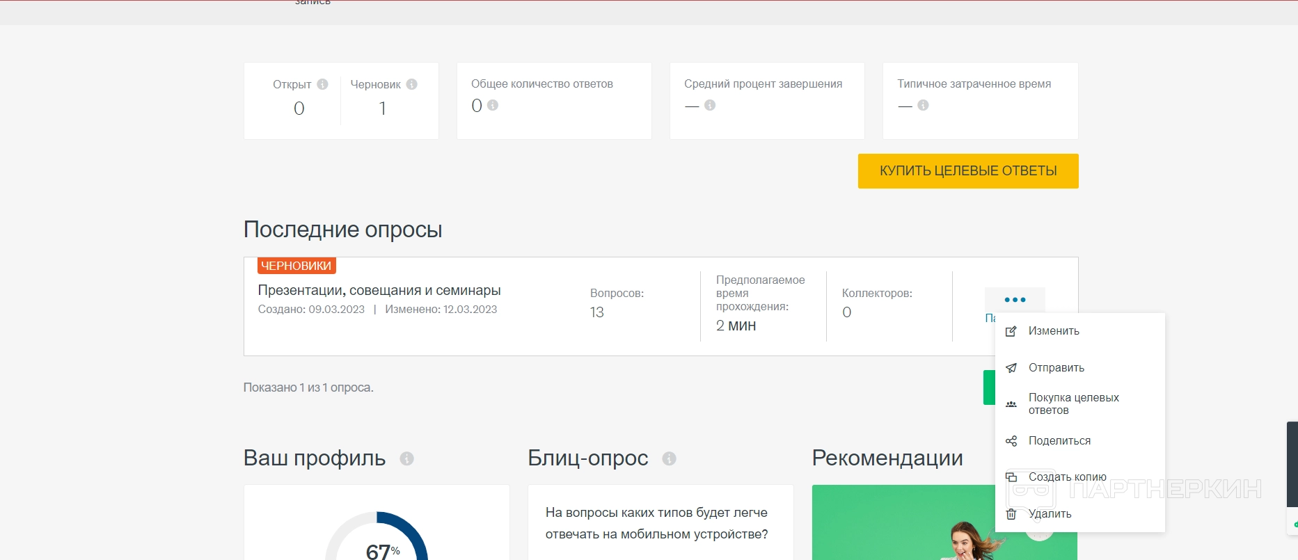 Если нажать на параметры, можно управлять черновиком — изменить данные опроса, отправить опрос, купить целевые ответы, поделиться ссылкой на него, создать копию или удалить.