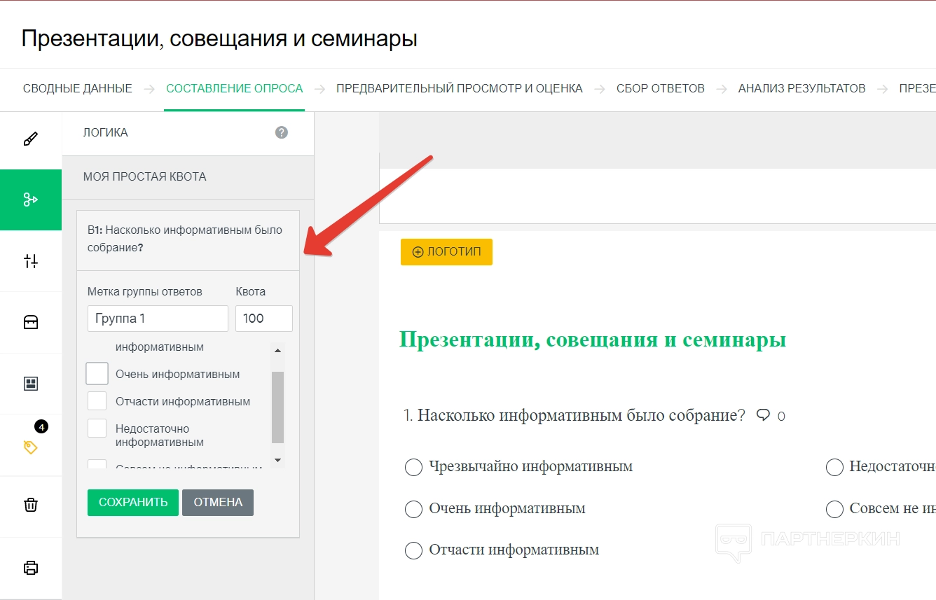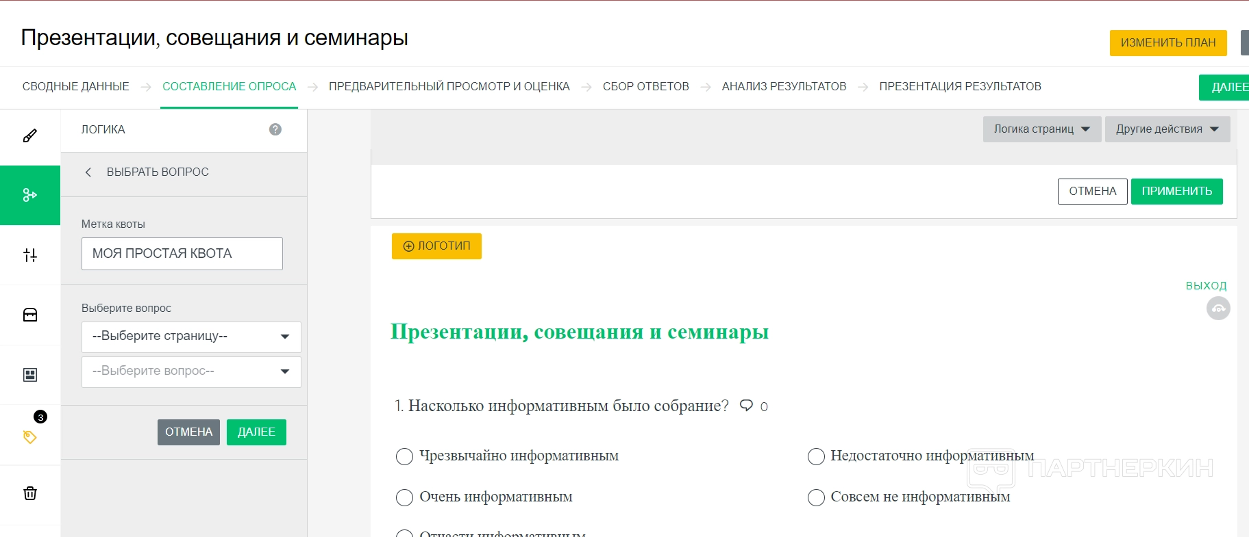 Квота — помогает задать ограничения для ответов на один вопрос или ответов на несколько вопросов. Смысл в том, что респонденты в процессе ответов наберут их определенное количество, и тогда опрос автоматически закрывается, даже если не был завершен. Например, если пользователь постоянно специально отвечает негативно и у него нет разнообразия в ответов, то система автоматически закроет для него опрос. Но это возможно только в том случае, если на все негативные ответы в нескольких вопросах наложить квоту.