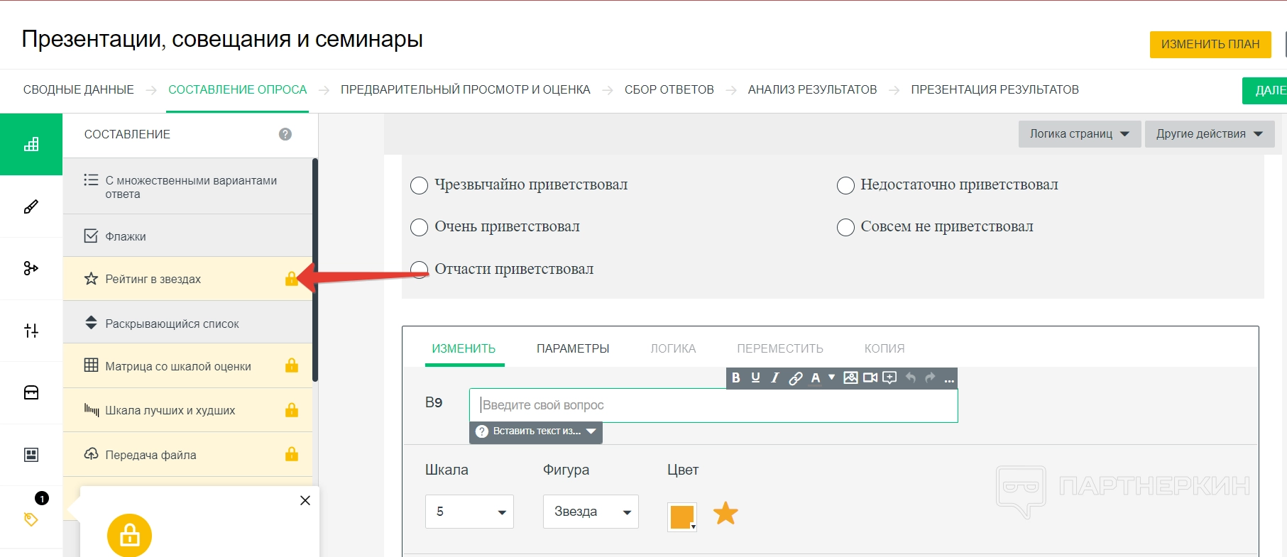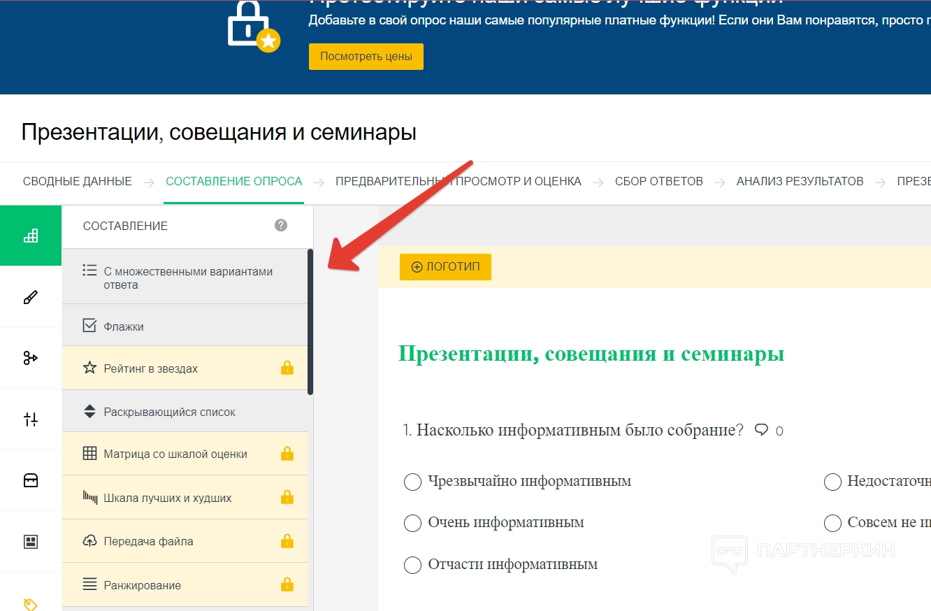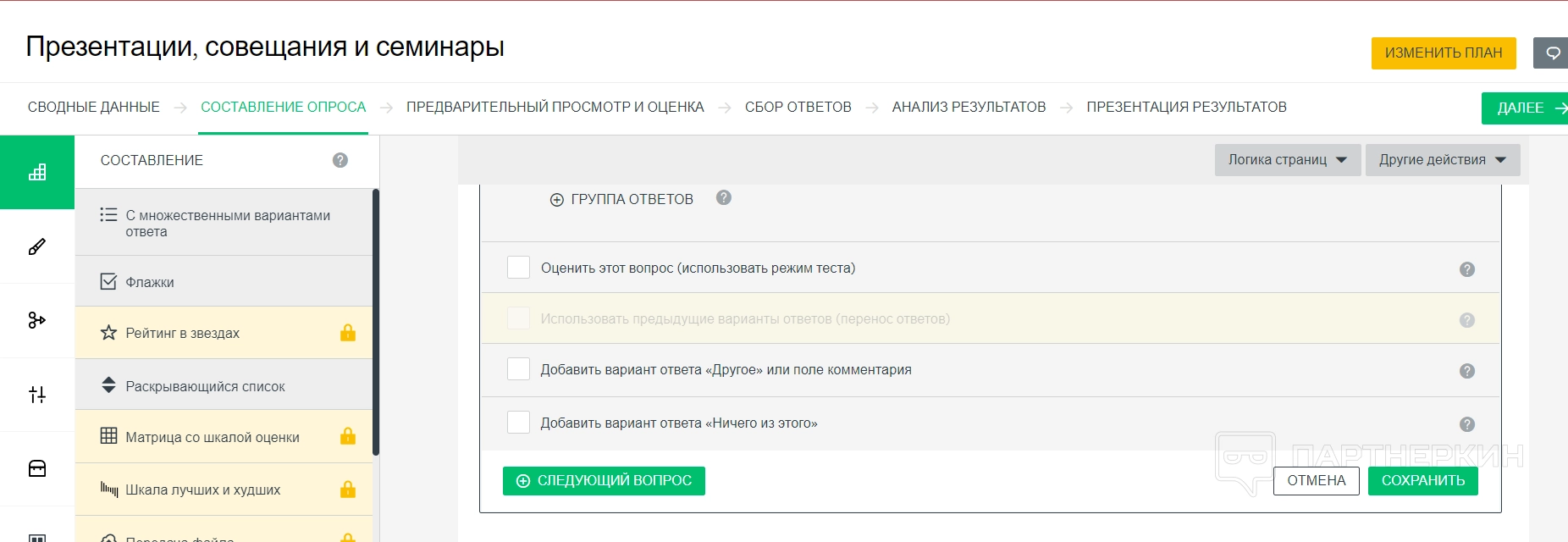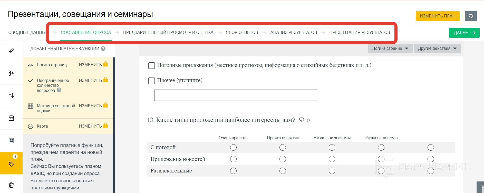 В этом разделе представлен весь список платных функций, которые пользователь применял в своем опросе. Сервис дает их возможность добавить, но при публикации этих вопросов попросит обновить свой план, чтобы они стали доступны. Поэтому при базовой подписке важно обращать внимание на эти фичи — они отмечены розоватым цветом и замком рядом.
